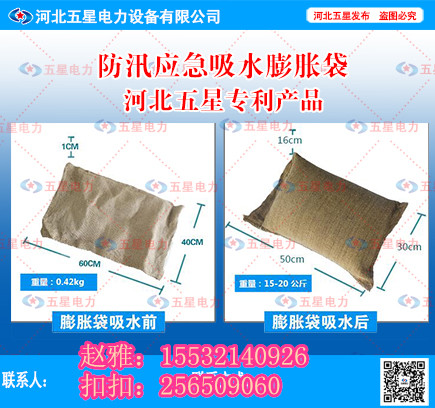 1 、河北五星電力設(shè)備有限公司的最新型“二合一”式防汛吸水膨脹袋使用前體積小,重量輕,存放,運輸方便.與傳統(tǒng)方法搶險可大 大減少人力,并可為搶險爭取時間.