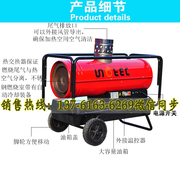 9、燃油熱風(fēng)機帶輪子及扶手,體積小巧,重量輕,一個人可以輕松移動。