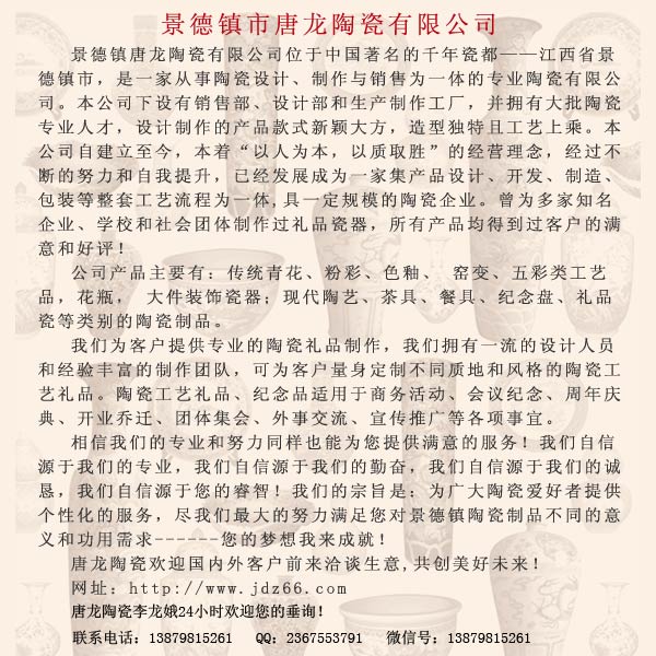 景德鎮(zhèn)陶瓷花瓶廠特殊訂制:有特殊需要,可在陶瓷大花瓶身上可燒制logo、公司名稱、人名、贈言,紀(jì)念用語,年月日等。