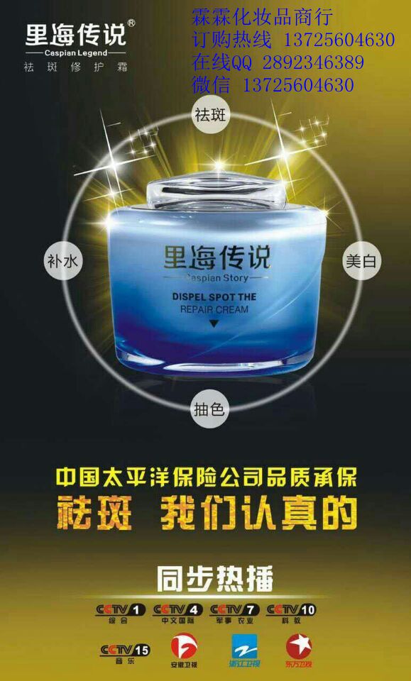 里海傳說修護霜1瓶30克,1瓶是一個月的量,3瓶為一療程針對曬斑、輻射斑1療程能淡化約60%—70%的色斑。老年斑2個療程能淡化70%的色斑。黃褐斑2個療程約淡化75%以上色斑。雀斑3個療程約淡化65%以上色斑。3.國內(nèi)唯一一家有明星代言可以做廣告 的去斑修護霜【里海傳說修護霜】產(chǎn)品賣點:美白、淡斑 提亮膚色光澤、源頭瓦解黑色素 去斑更防斑、性子溫和、安 全、健康、無刺激、不依賴 不反彈。使用方法:任意產(chǎn)品搭配、乳液與面霜中間早晚使用,涂完去斑修護霜家里面霜正常使用。進口配方:不含激素 、鉛汞 、不含任何國家違禁成份適合問題人群:雀斑、黃褐斑 、曬斑、 內(nèi)分泌失調(diào)斑 、妊娠斑、肝斑、宮斑、皮膚暗黃、膚色不勻等。