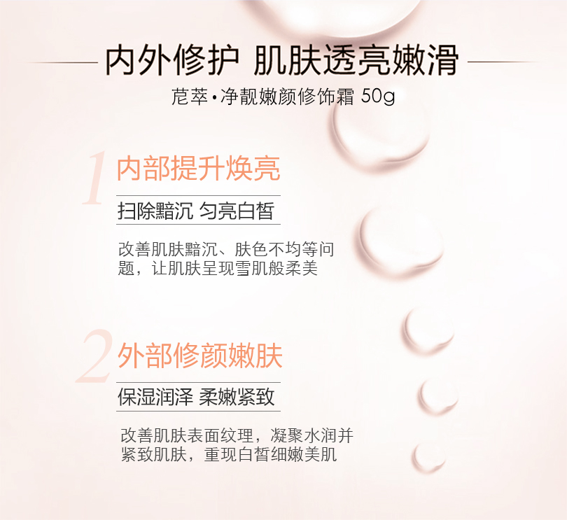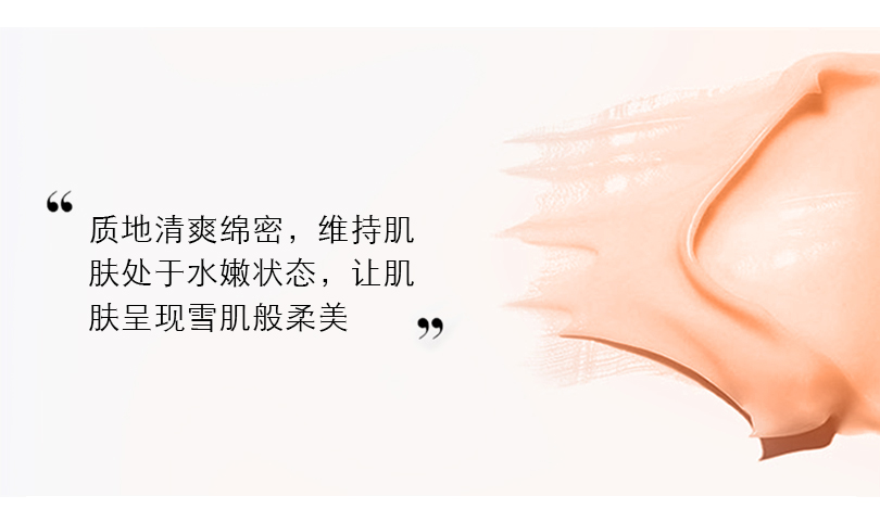 產(chǎn)品功效:苨萃凈靚嫩顏修飾霜質(zhì)地清爽綿密,改善肌膚表面,凝聚水潤并緊致肌膚,讓肌膚呈現(xiàn)雪肌般柔美。