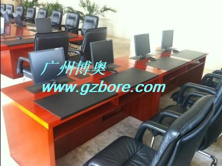 結(jié) 構(gòu):每張桌子配置2臺(tái)電動(dòng)遙控液晶升降機(jī)(當(dāng)時(shí)電腦時(shí)液晶顯示器自動(dòng)重桌底升起且顯示器自動(dòng)通電,當(dāng)不使用顯示器時(shí),顯示器自動(dòng)隱藏于桌底),電腦桌前面設(shè)有檢修門,方便線路維修。