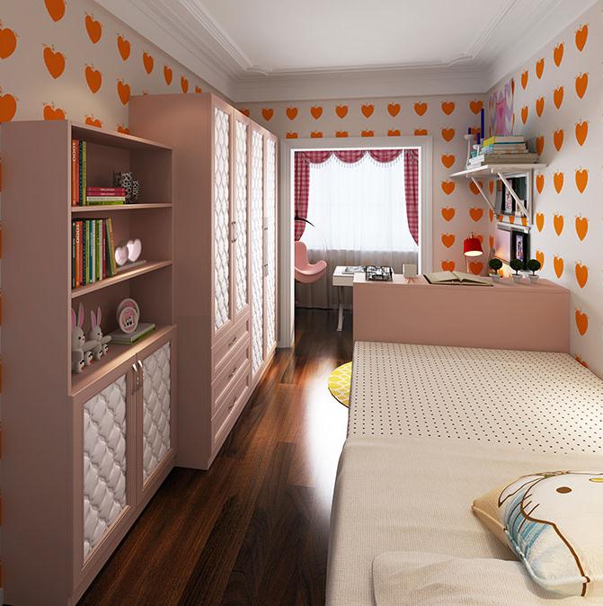 狹長型的空間兩側擺放家具,衣柜緊挨書柜,床與書桌并列,中間用隔斷收納柜隔斷。粉 色奠定浪漫夢幻的基調,對空間的合理規(guī)劃和布局凸顯實用性和舒適度。