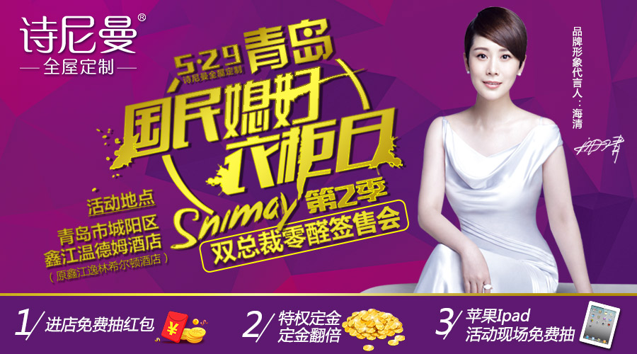 “5.29國民媳婦衣柜日”青島雙總裁零醛 簽 售會(huì),進(jìn)店免費(fèi)抽紅包,預(yù)存100元=529元,預(yù)存1000元=2000元,預(yù)存3000元=5000元,蘋果ipad活動(dòng)現(xiàn)場(chǎng)免費(fèi)抽,進(jìn)店還有眾多小禮品贈(zèng)送