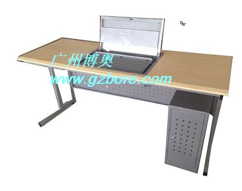 結(jié) 構(gòu):使用時只要打開鎖,液晶顯示屏便會自動翻起,鍵盤也同時自動打開。當不使用時,可用手動按下翻蓋面板。整個翻轉(zhuǎn)器與桌面齊平,產(chǎn)品具有防塵保持桌面平整,美化桌面等功能。電腦主機位置有鎖上,可防盜,
