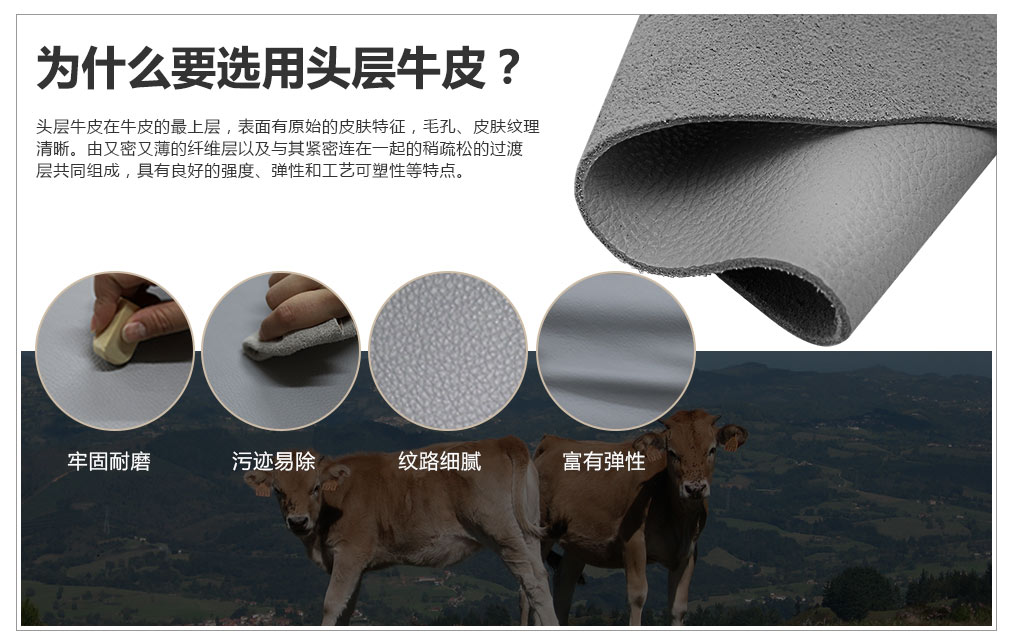 1.頭層牛皮打造:沙發(fā)的坐面、靠面和扶手均采用優(yōu)質的頭層牛皮作為基料,觸感柔軟舒適,,具有超強透氣性,久坐也不悶。
