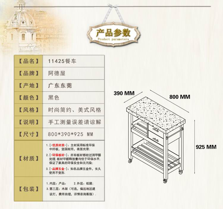 材質(zhì)選用出口專用p2級板材,具有美式鄉(xiāng)村的簡約創(chuàng)作簡樸、自然、愉悅的氛圍。仿大理石桌面,表面仿大理石工藝,防水、防刮、桌面清潔更加容易。側(cè)面掛位設(shè)計,側(cè)面可放置毛巾,貼心、方便。大儲物空間,內(nèi)部結(jié)構(gòu)同樣經(jīng)得起挑剔的眼光,細(xì)節(jié)處依然講究細(xì)致的工藝?梢苿榆囕喸O(shè)計,底部加有車輪,輕松移動餐車,可鎖死車輪。運輸采用紙箱包裝,軟床,柜子等包裝里面為珍珠棉、海綿皮貨氣泡袋,外層為防震制皮包裝,全程保護(hù)您的家具。