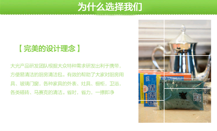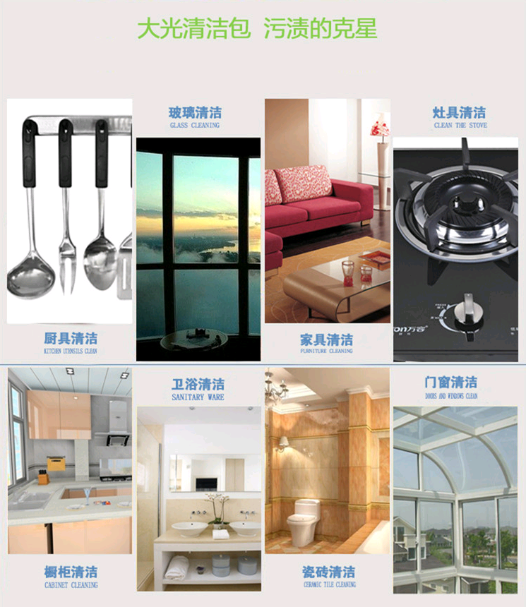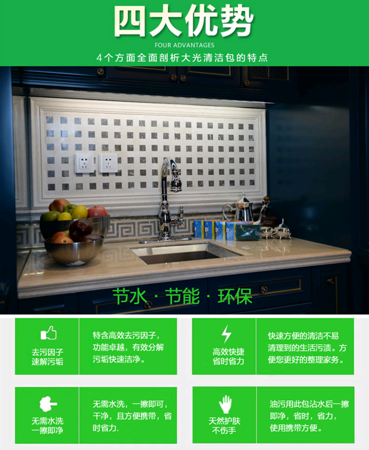 特點(diǎn):高效,廚房各種灶具,玻璃門窗,油污,異味,用此包沾水后一擦即凈,省時,省力,使用攜帶方便,環(huán)保節(jié)能無腐蝕,不用帶橡膠手套,更不會嗆鼻子、熏眼睛。產(chǎn)品表面臟污手搓水沖即凈,千萬不要用手?jǐn)D,擠一次少用十次。