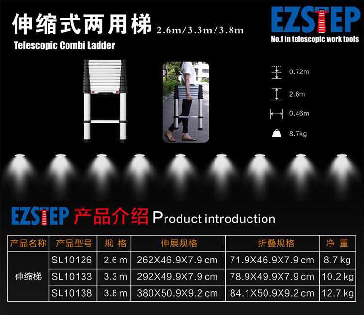 折疊后占用空間小,外出作業(yè)時(shí)攜帶方便。使用時(shí)靠著墻壁或樓臺(tái),可伸縮不同高度,滿(mǎn)足用戶(hù)需求。