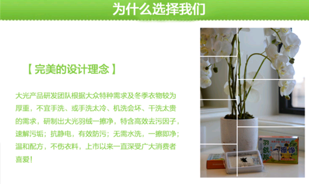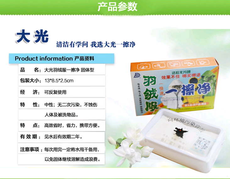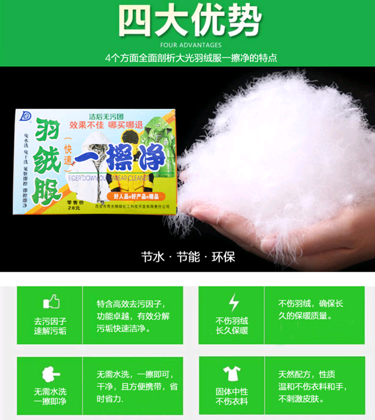 西安 奇光精細化工科技開發(fā)有限責任公司成立于1992年,歷經(jīng)30余年的市場調(diào)研,本著“環(huán)保節(jié)能,原創(chuàng)科技,奇光智造”的宗旨,成功開發(fā)出大光牌“羽絨服快速一擦凈、旅游鞋快速一擦凈及廚衛(wèi)大清潔包”等壟斷性快潔產(chǎn)品,產(chǎn)品遠銷南非、西班牙、香港以及國內(nèi)80%以上的大中型城市,3000多萬塊購買使用,3億余人次體驗,銷售勢頭看好。