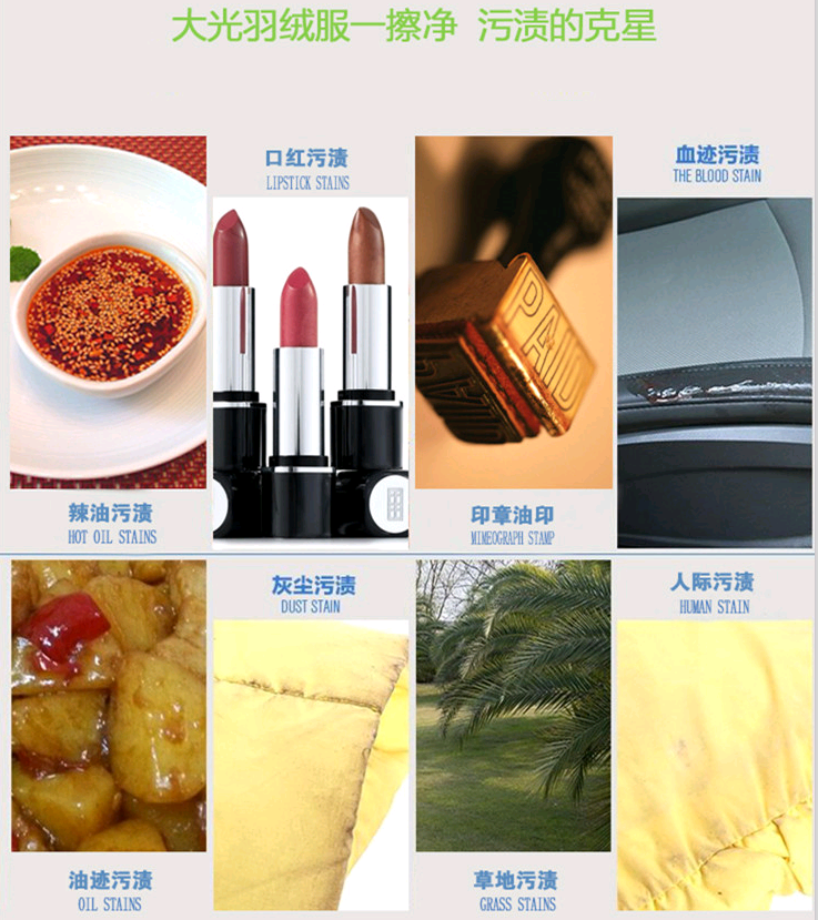 適用范圍:辣油污漬、口紅污漬、印章污漬、血液污漬、油跡污漬、灰塵污漬、植物污漬、人際污漬等。