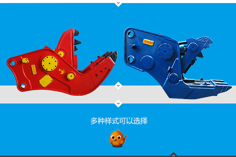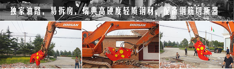 力道強(qiáng)勁=超高效率1、工作效率是破碎錘的二至三倍。 2、粉 碎鉗可以出色的完成一系列作業(yè):即將鋼筋從混凝土塊中分離出來,折彎并裝載到卡車上,從而明顯的提高了工作效率。 3、作業(yè)完全機(jī)械化,安 全又省時(shí)。 大開大闔=提高效率1、咬合密實(shí)間隙小,操作靈活。 2、大開口設(shè)計(jì),工作輕松、方便。 3、裝有鋼筋切斷器,粉 碎鉗可以同時(shí)進(jìn)行兩項(xiàng)作業(yè),粉 碎混凝土并切斷暴露的鋼筋,使破碎作業(yè)效率更高。 堅(jiān)固耐用=節(jié)約成本1、采用瑞典高硬度輕質(zhì)鋼材,堅(jiān)實(shí)無比! 2、充分了解中國市場(chǎng)使用習(xí)性,針對(duì)磨耗部件及結(jié)構(gòu)件重點(diǎn)強(qiáng)化,壽命加倍! 3、顎齒制成了特殊形狀用以牢固的固定混凝土塊,楔入并粉 碎,以便進(jìn)行快速軋碎。顎齒非常堅(jiān)固,具有高耐磨性。 輕便快捷=創(chuàng)造效益1、拆裝容易,獨(dú)家油路設(shè)計(jì),不僅油缸速度加倍,并且可與破碎器通用,一機(jī)多任務(wù)。 2、低噪音無振動(dòng),滿足環(huán)保要求,適合城市與高新園區(qū)的拆除工程。 3、液壓油缸配有護(hù)蓋,用以阻攔混凝土塊和鋼筋的飛濺碎屑。