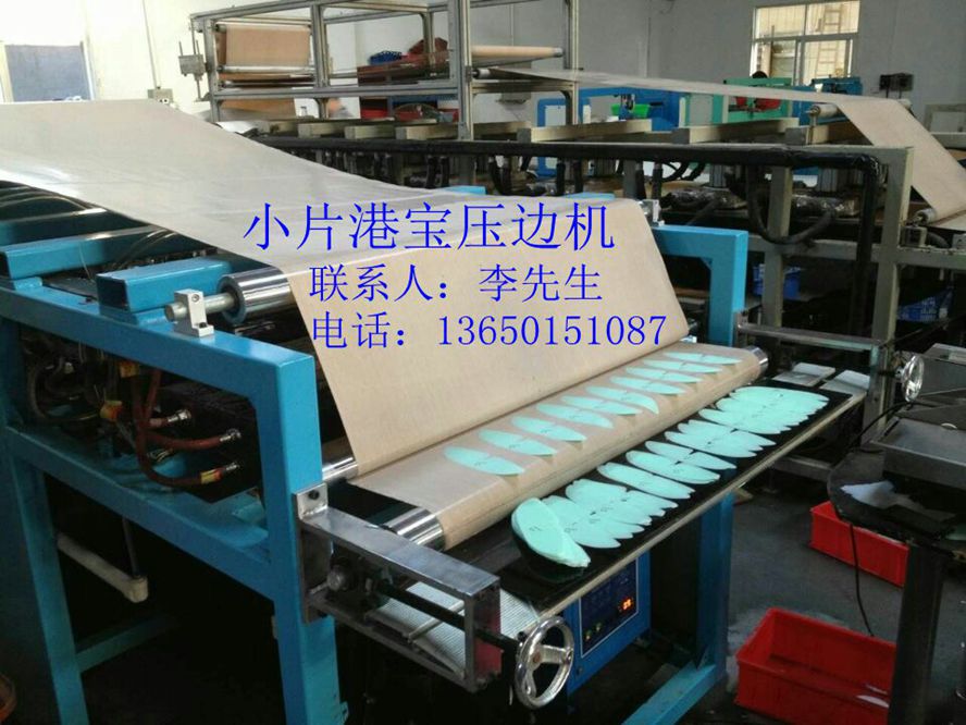 3、港寶小片壓邊成型機(jī),生產(chǎn)流程:刀模先裁好小片,再經(jīng)過壓邊機(jī)加熱壓邊或輥壓使小片周邊壓薄,然后經(jīng)過冰 水冷卻,輸送到后面自動(dòng)缷料,一雙一雙的周圍薄的好像削邊的港寶小片就加工出來了。