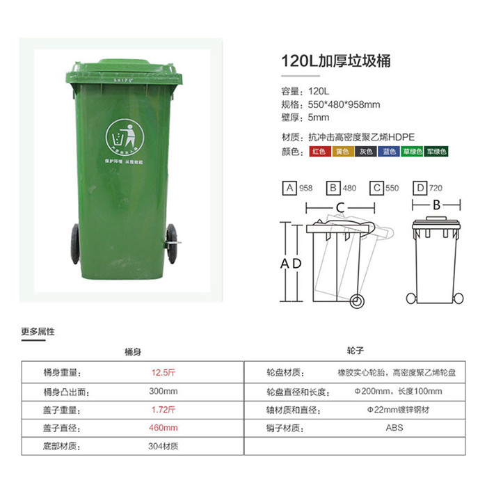 3. 120升餐廚垃圾桶全新升級(jí),美觀大方,不僅可藏污納垢,更可分類擺放,我們可根據(jù)您的分類要求為您定制模板,保證符合您的要求。垃圾桶品質(zhì)有保證,是市政建設(shè)的好幫手。用途:垃圾周轉(zhuǎn),存放,分類等。
