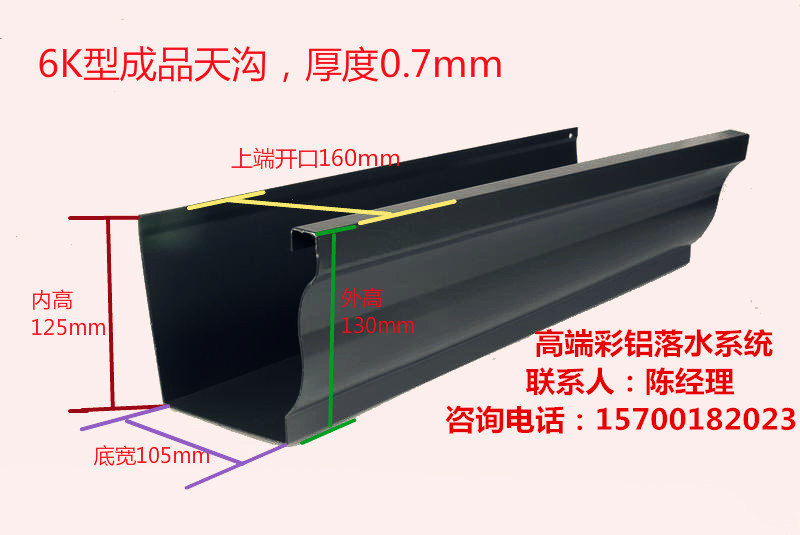 廠家直銷、大量低價批發(fā)出售別墅雨落水系統(tǒng)、成品天溝、檐溝、k型天溝、落水管、方形雨水管,10米起批,落水系統(tǒng)是杭州可成建材科技有限公司的專利主打產(chǎn)品,暢銷全國。可成建材科技落水系統(tǒng)優(yōu)勢所在: 1、 多種規(guī)格尺寸的5英寸,7英寸,80*100排水管,從別墅到高層建筑,再到大型建筑均可使用; 2、 可成推薦: 5英寸一半使用于別墅等小型建筑; 3、 可成推薦: 7英寸使用于大型 ,小高層建筑等; 4、 可成推薦: 80*100雨水管可使用與高層建筑,大型建筑等。 可成公司引進國外先進技術,并以獨特的產(chǎn)品配方不斷研發(fā)天溝新產(chǎn)品,同時嚴把質量關,做到全方位的服務,讓銷售出去的每件產(chǎn)品都能使客戶滿意,以滿足各層次人們的需求,使每個人都能擁有一個理想的家居環(huán)境?沙晒旧a(chǎn)的天溝配件有二十多種,品種齊全,公司擁有各類成型、表面處理設備,可以為客戶提供各種口徑和形狀的成品配件,廣泛應用于各個行業(yè)的屋面排水系統(tǒng),可以為客戶加工各種形狀、各種材質、各種規(guī)格的落水系統(tǒng),希望以最好的質量和服務;百年建筑的美麗和諧貢獻自己的力量。