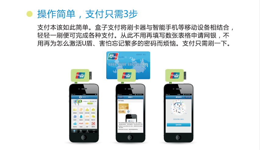 商戶收單產(chǎn)品-錢盒商戶通手機(jī)pos作為一款已經(jīng)耕耘了2年的成熟產(chǎn)品,目前全面支持銀聯(lián)借記卡、信用卡, 不僅具備傳統(tǒng)收款功能, 更能為用戶提供電子賬本功能、產(chǎn)品管理、會(huì)員管理、營(yíng)銷管理、便民業(yè)務(wù)、金融業(yè)務(wù)等多項(xiàng)增值服務(wù),在用戶體驗(yàn)上具有絕對(duì)優(yōu)勢(shì). 盒子支付錢盒商戶通手機(jī)pos全面支持銀聯(lián)借記卡、信用卡,不僅具備傳統(tǒng)收款功能, 更能為用戶提供電子賬本功能、產(chǎn)品管理、會(huì)員管理、營(yíng)銷管理、便民業(yè)務(wù)、金融業(yè)務(wù)等多項(xiàng)增值服務(wù),徹底顛覆傳統(tǒng)pos僅能收錢的單一概念,是世界上“第一款掙錢的pos”。不僅如此,錢盒商戶通手機(jī)pos還具有體型小巧、便于攜帶的外形特點(diǎn)。 智能手機(jī)的逐漸普及使當(dāng)今時(shí)代已經(jīng)成為手機(jī)時(shí)代,通過手機(jī)進(jìn)行消費(fèi)已經(jīng)逐漸被大眾所接受。