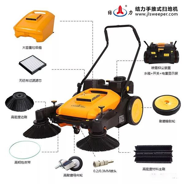 結(jié)力jl920s手推式掃地機,是噴霧抑塵掃地機,適用于水泥、瀝青、塑膠、環(huán)氧、方磚、毛石等地面。這款掃地機前端的兩個噴頭噴出高壓水霧,高壓水霧與前刷工作時產(chǎn)生的揚塵結(jié)合后迅速下墜落地,隨前刷及滾刷的工作,與垃圾、粉 塵一起收入垃圾箱內(nèi),不但能解決前刷工作時的揚塵問題,而且達(dá)到更好的清掃效果。
