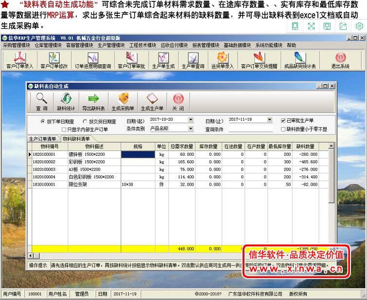 信華erp生產(chǎn)管理系統(tǒng) 根據(jù)五金、機(jī)械行業(yè)具有明顯的訂貨量小、產(chǎn)品品種變化多、五金件表面處理顏色多、加工工藝不斷變化等特征而設(shè)計(jì)的生產(chǎn)管理軟件。