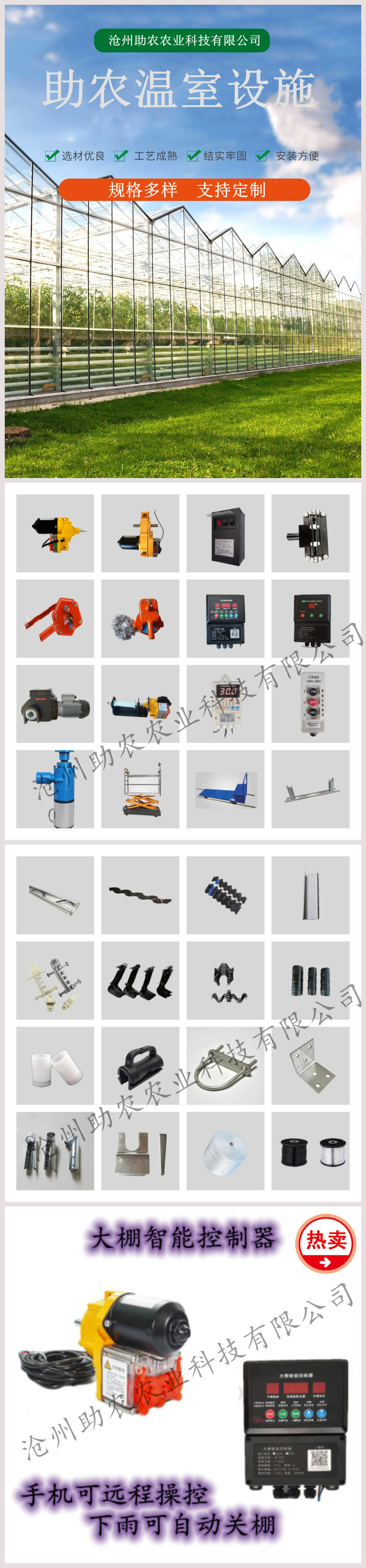 生產(chǎn)、銷(xiāo)售溫室大棚配件電動(dòng)卷膜器,手動(dòng)卷膜器,大棚骨架,智能放風(fēng)系統(tǒng),電動(dòng)卷膜器適配溫控儀,電動(dòng)卷膜器電源,電動(dòng)卷膜器開(kāi)關(guān),爬升器,保溫被,卷簾機(jī),溫室骨架,卡槽、卡簧、壓膜卡、固定卡、連接管、壓頂簧、壓膜繩等。