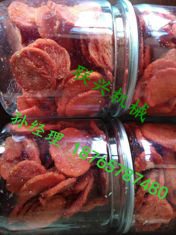 胡蘿卜脆片是胡蘿卜脫水后升級的一種食品,是一種大眾化休閑食品,它主要是利用真空油炸機(jī)制作而成的。新鮮的胡蘿卜經(jīng)過挑選之后,去皮、切片、蒸煮后,放到真空油炸機(jī)里面油炸,直到泡沫逐漸消失,油炸自動結(jié)束,然后自動脫油、脫水。干干脆脆的胡蘿卜脆片便出鍋了。。生的胡蘿卜片小編本人是不喜歡吃的,但是經(jīng)過真空油炸機(jī)之后的胡蘿卜脆片是愛不釋手呀,爽脆可口,味道好極了。