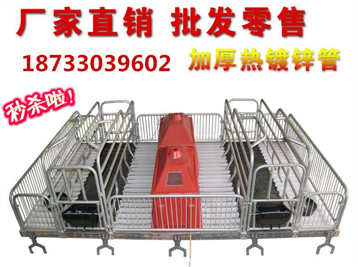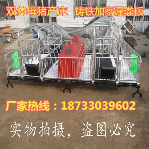 母豬雙體產(chǎn)床規(guī)格2.1*3.6,轉(zhuǎn)為母豬分娩設(shè)計的尺寸加重杠梁設(shè)計,母豬位復(fù)合漏糞板,耐腐蝕,易清洗。