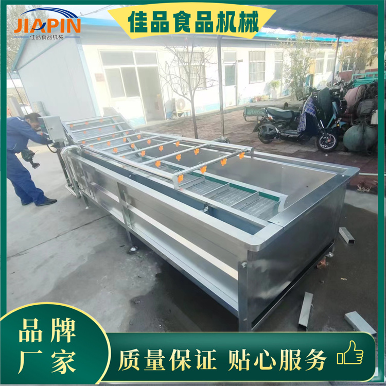 佳品食品機(jī)械清洗機(jī)采用雙槽體設(shè)計(jì),便于清洗。槽體采用椎體結(jié)構(gòu),使排水更干凈,同時(shí)在放水口的另一側(cè),備有清洗孔眼,便于水槍進(jìn)行徹底沖洗。通過(guò)設(shè)備底部的氣泡管噴出高壓氣體,帶動(dòng)水上下翻滾,從而使蔬菜產(chǎn)生翻滾,加上槽體上部的高壓水噴淋,將漂浮上來(lái)的蔬菜再次打入水中,產(chǎn)生多次的翻滾,達(dá)到理想的清洗效果。水泵的進(jìn)水處設(shè)有過(guò)濾網(wǎng),將清洗過(guò)程中的漂浮物和雜z質(zhì)進(jìn)行過(guò)濾。設(shè)備在提升段設(shè)有清水噴淋裝置,客戶可以根據(jù)清洗的要求,決定是否接入清水噴淋,本設(shè)備根據(jù)客戶要求,采用了加強(qiáng)內(nèi)部結(jié)構(gòu)設(shè)計(jì),內(nèi)部輸送裝置可以圍繞前面的鉸接點(diǎn)旋轉(zhuǎn),從而將內(nèi)膽提出來(lái),以便于生產(chǎn)過(guò)后的內(nèi)部清洗;升降方式既可以人工升降,也可以電動(dòng)升降。