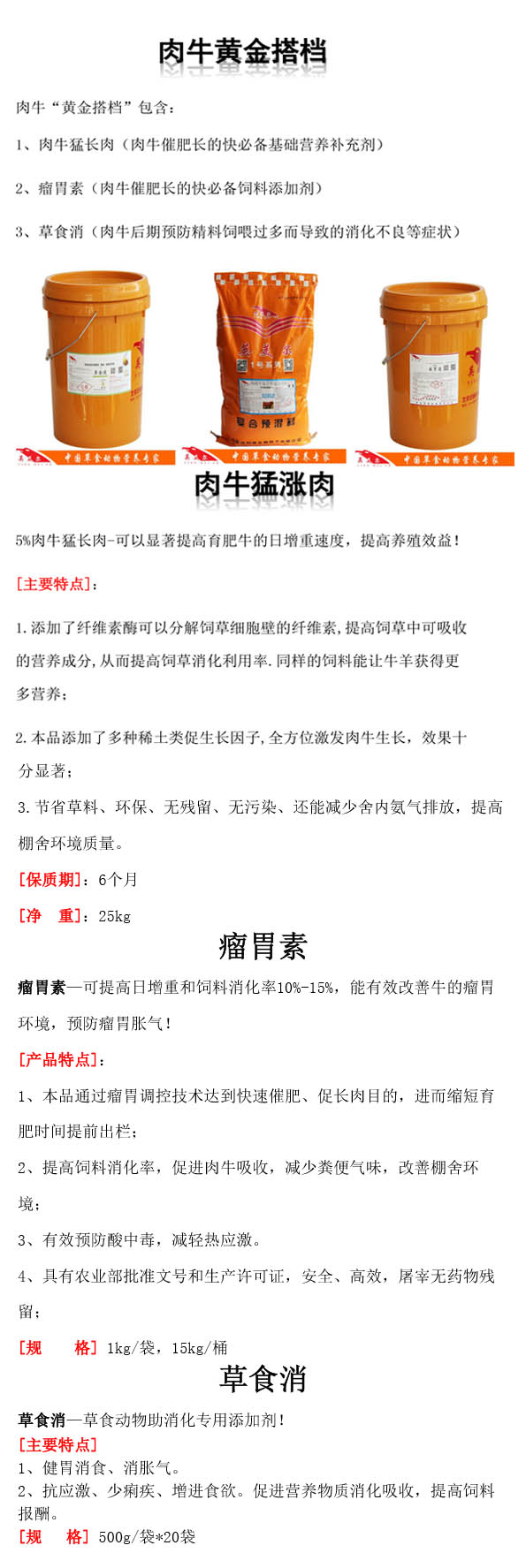 為了達(dá)到更快的催肥速度,加快肉牛出欄,建議用肉牛羊的催肥飼料添加劑 產(chǎn)品,包括用于健胃、消食、促消化和擁有強(qiáng)化牛瘤胃功能、提升吸收轉(zhuǎn)化率的飼料添加劑 產(chǎn)品。