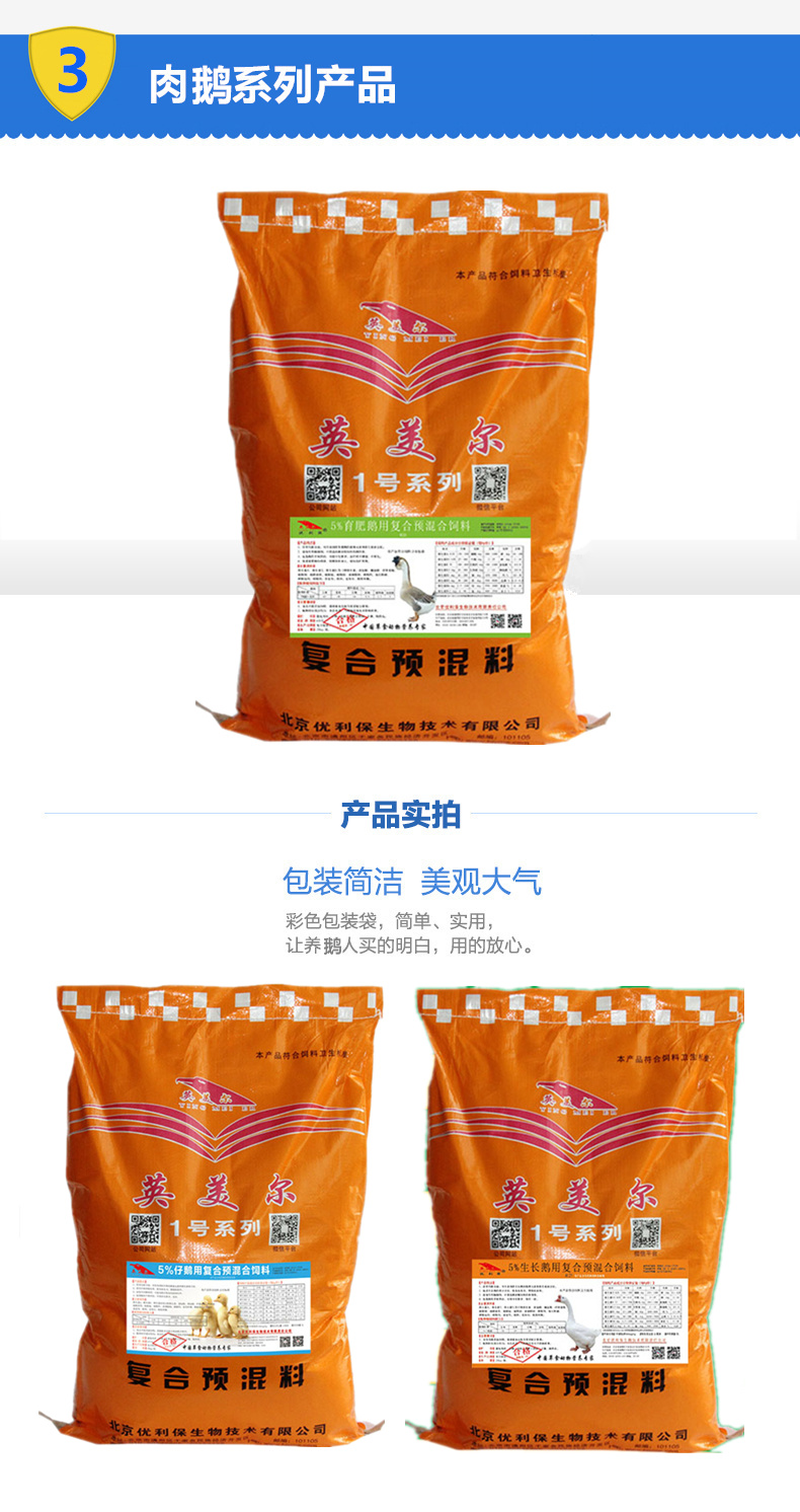 產(chǎn)品特點(diǎn):營(yíng)養(yǎng)均衡全面,可有效預(yù)防育肥鵝的微量元素 和維生素 缺乏癥。促進(jìn)育肥鵝的增重,使鵝體形碩大,縮短出欄周期。