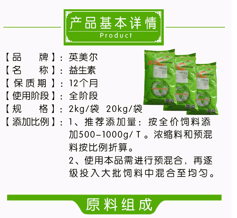 英美爾公司開發(fā)生產(chǎn)的益生菌類飼料添加劑 -優(yōu)利益生素 ,有效改善牛羊等各種家禽家畜腸道平衡,顯著增加腸道內(nèi)益生菌數(shù)量,使得飼料的消化吸收更加高效,也就是減少了糞便中蠅蛆可利用的物質(zhì),對(duì)改善養(yǎng)殖欄舍環(huán)境大有效果。是一款各類養(yǎng)殖戶都很熱衷的科學(xué)新型的飼料添加劑 。