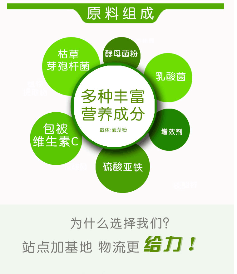7種以上營養(yǎng)成分:硫酸 亞鐵、包被維生素 c、枯草芽孢桿菌、酵母菌粉 、乳酸 菌、增效劑 等,載體為麥 芽粉 。